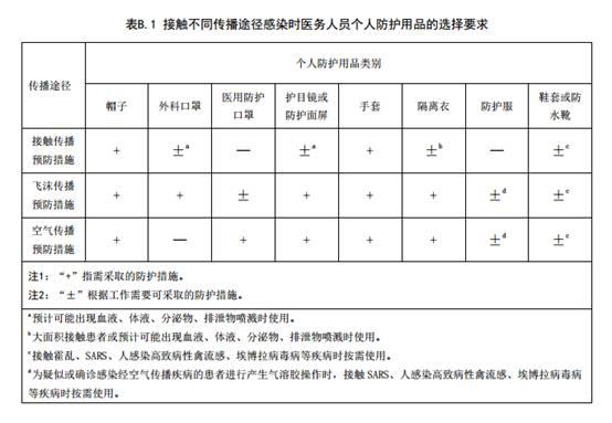 表B.1 接觸不同傳播途徑感染時醫(yī)務(wù)人員個人防護用品的選擇要求