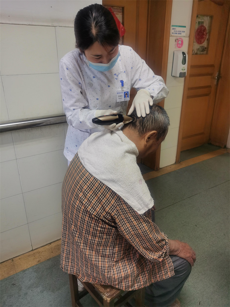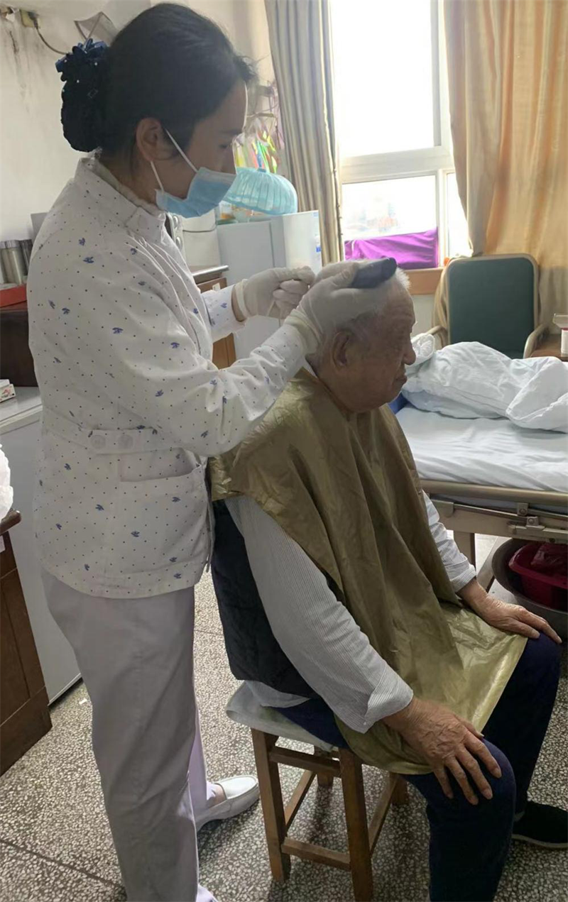 新冠恰似一道無形的冰冷的墻,阻隔了患者與外界的聯(lián)系,給他們的生活造成了一定的影響。按照疫情防控的要求,病人和陪客住院期間嚴格防護、嚴禁外出,理發(fā)師進不來,頭發(fā)長長了卻不能理發(fā)的煩惱困擾著病房里的爺爺們。為此,臨湖一病區(qū)會理發(fā)的護士們踴躍報名為老人們理發(fā),解決他們的難題。