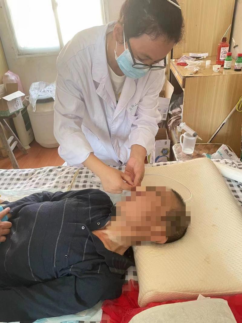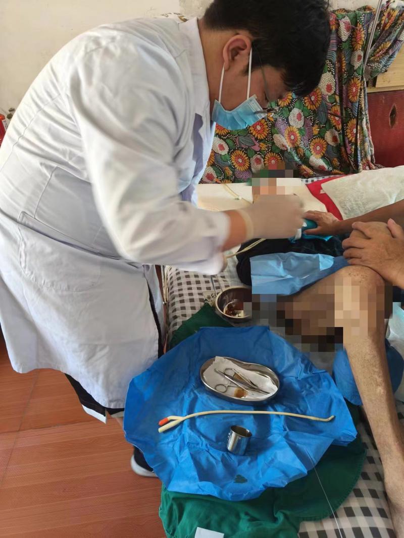 6月9日,重癥醫(yī)學(xué)科派出多名醫(yī)護(hù)人員,專車來到患者家中。到達(dá)目的地后,醫(yī)護(hù)團(tuán)隊(duì)對(duì)患者予以體格檢查、評(píng)估病情?;颊咭蜷L(zhǎng)時(shí)間臥床,又無法得到較完善的護(hù)理,未能及時(shí)予以更換尿管等,現(xiàn)患者胃管已經(jīng)發(fā)黑發(fā)硬,尿道外口存有大量分泌物未清理,壓瘡甚至有繼續(xù)惡化可能。經(jīng)過徐潛醫(yī)生對(duì)患者進(jìn)行詳細(xì)評(píng)估、確認(rèn)病情后,為患者進(jìn)行了更換胃管、尿管等相關(guān)管道處置,隨后楊艷主管護(hù)師仔細(xì)查看患者壓瘡創(chuàng)面,予以清創(chuàng)換藥,并對(duì)家屬進(jìn)行了詳細(xì)的宣教,教導(dǎo)家屬如何護(hù)理相關(guān)管路,如何處理壓瘡及相關(guān)護(hù)理,以及日常生活所需注意事項(xiàng)?;颊呒覍賹?duì)此次居家護(hù)理服務(wù)表示了極大的感謝,“市人民醫(yī)院一直是我們百姓信賴的醫(yī)院,你們不辭辛苦跑到我們這來,真是幫我們的大忙了,不知道怎么感謝你們才好!”