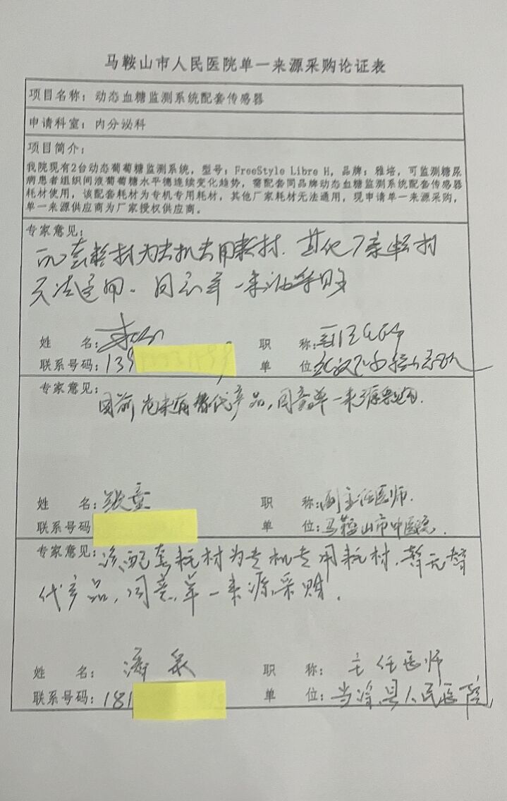 馬鞍山市人民醫(yī)院呼吸科現(xiàn)2套,品牌雅培,設備型號:Free Style Libre H。設備使用須配套同品牌傳感器使用。第三方傳感器不能與設備兼容,為此擬單一來源采購。鑒于以上原因,依據(jù)《政府采購法》第三十一條采用單一來源采購方式的條件“只能從唯一供應商處采購的”條款,同意采用單一來源方式采購