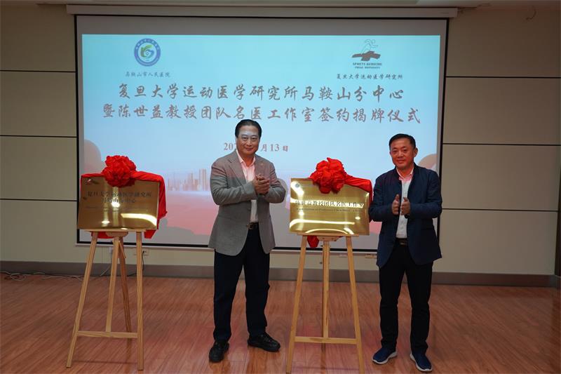 孫信濱主任和陳世益教授共同為“復(fù)旦大學(xué)運動醫(yī)學(xué)研究所馬鞍山分中心”和“陳世益教授團隊名醫(yī)工作室”揭牌。