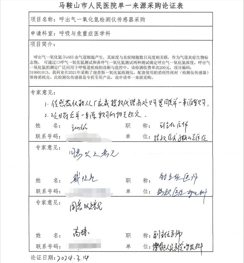 馬鞍山市人民醫(yī)院一氧化氮檢測儀傳感器采購項目 單一來源采購公告