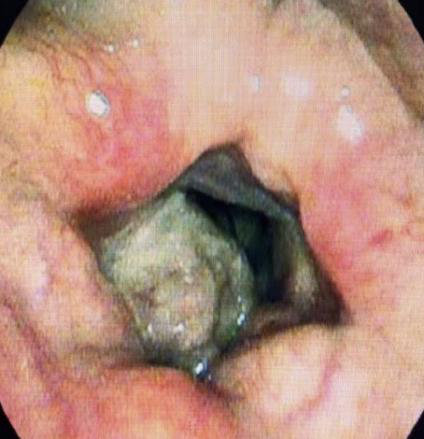 電子鼻咽喉鏡下見:右側(cè)聲帶較大腫物堵塞聲門,聲門空間很狹小。