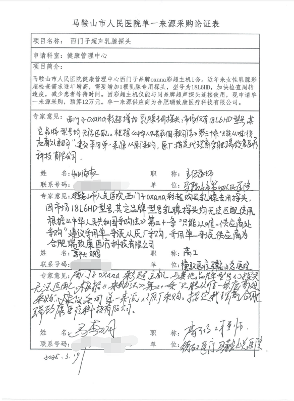 馬鞍山市人民醫(yī)院西門子超聲乳腺探頭采購單一來源標前公示