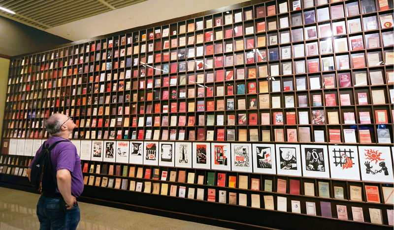 2018年5月9日,一位外國(guó)觀眾被北京“真理的力量——紀(jì)念馬克思誕辰200周年主題展覽”中一面展示不同國(guó)家出版的500多種《共產(chǎn)黨宣言》的書(shū)墻所吸引。