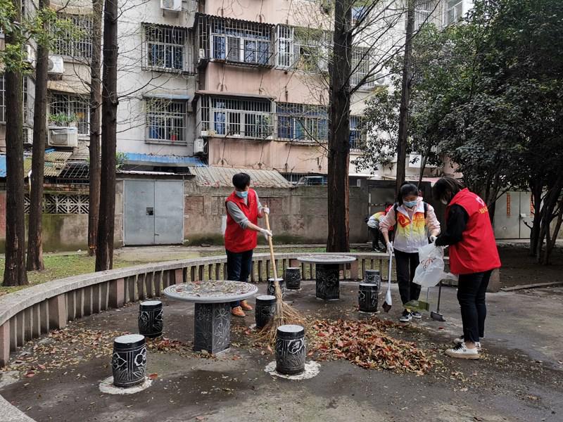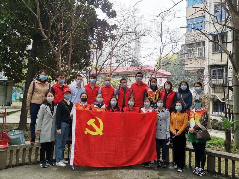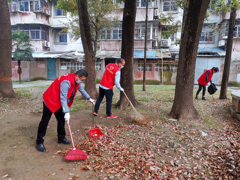外一黨支部副書記汪敏徽帶領(lǐng)黨員志愿者們清掃社區(qū)綠化區(qū)域。志愿者們身穿紅馬甲,佩戴口罩、手套做好個人防護,拿著打掃清理工具分工協(xié)作、相互配合,將垃圾清理的干干凈凈。