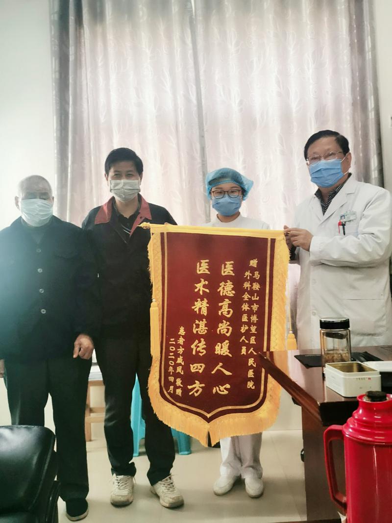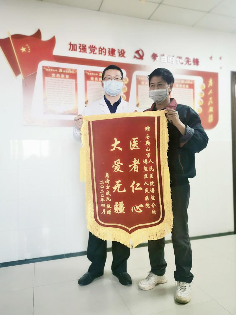 4月20日,市人民醫(yī)院博望分院收到來自患者方咸鳳家人送來的繡有“醫(yī)者仁心 大愛無疆”、“醫(yī)德高尚暖人心 醫(yī)術精湛傳四方”字樣的兩面錦旗。