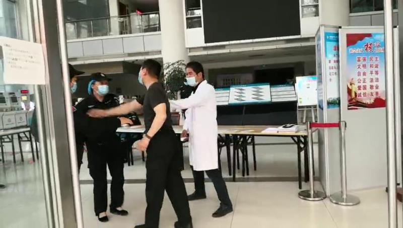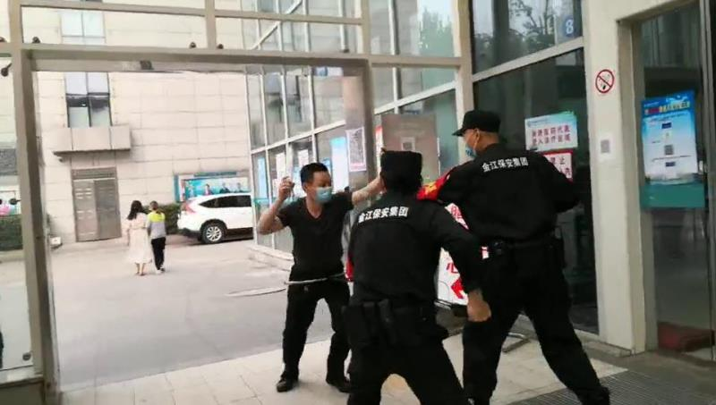 此次演練的事件背景為醫(yī)院進(jìn)行日常防疫工作期間,一名就診患者(安保隊員扮演)因醉酒拒不配合測溫和流行病學(xué)調(diào)查,與測溫的醫(yī)務(wù)人員發(fā)生爭執(zhí),意圖強行進(jìn)入門診,經(jīng)安保人員勸阻仍情緒激動,遂掏出管制刀具(模擬刀具)胡亂揮舞,意欲傷害醫(yī)務(wù)人員和周圍群眾,現(xiàn)場情況危急。