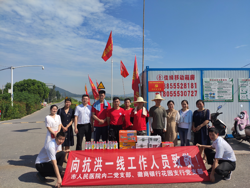 8月1日,我院內(nèi)二黨支部和徽商銀行花園支行黨支部共同開展“把愛心送上抗洪搶險一線—慰問市直機(jī)關(guān)黨員突擊隊”主題黨日活動。