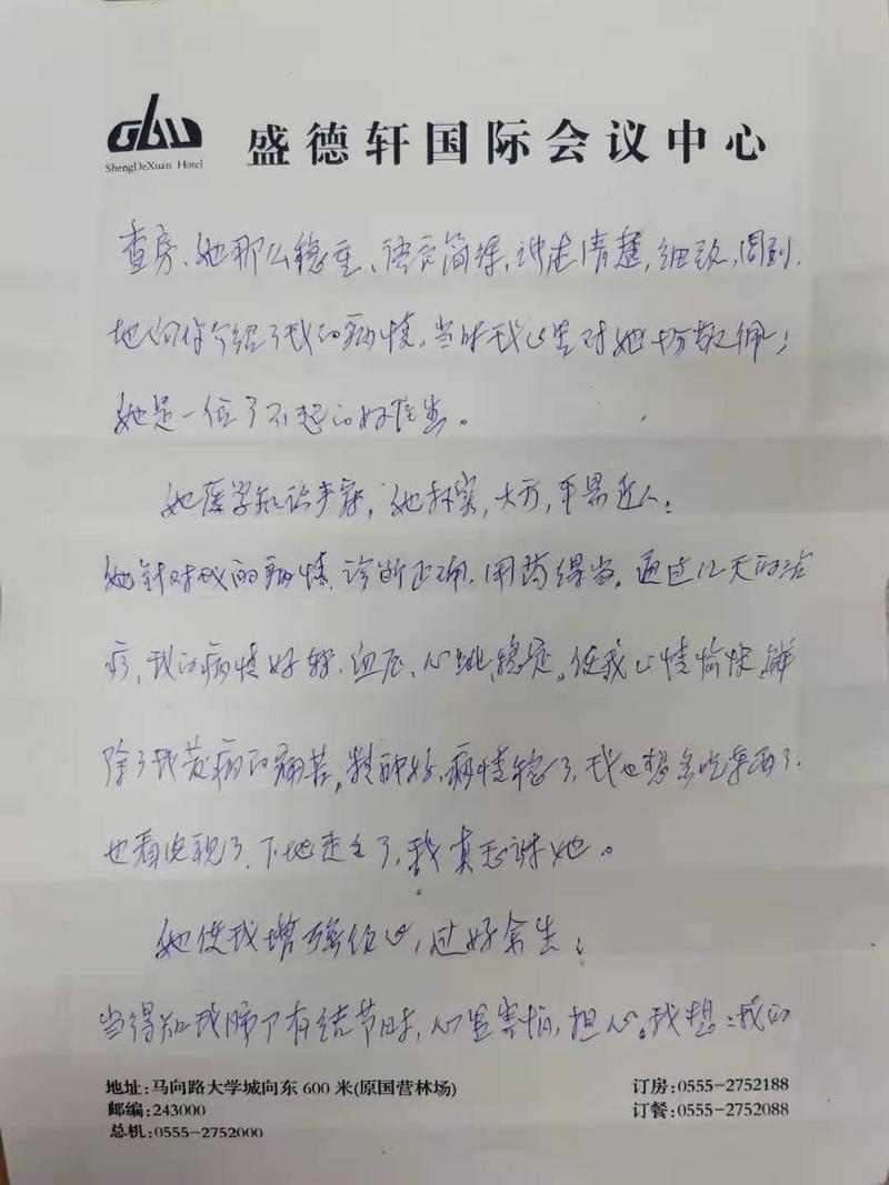 她醫(yī)學(xué)知識(shí)豐富,樸實(shí)大方、平易近人:她針對(duì)我的病情診斷正確,用藥得當(dāng)。通過(guò)幾天的治療,我的病情好轉(zhuǎn),血壓和心跳穩(wěn)定,心情愉快,解除了我黃疸的痛苦,精神好,病情穩(wěn)定,我也想吃東西了,也看電視了,可以下地走走了,我真心感謝她。