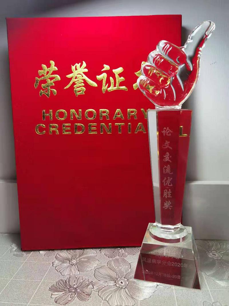 本次年會特邀國內(nèi)數(shù)十位知名專家參會講學(xué),除主會場外,還設(shè)立了中青年論壇、病例分享和臨床護理典型案例分享競賽專場,充分展示了風(fēng)濕免疫學(xué)科的發(fā)展前景。會上,風(fēng)濕免疫科住院醫(yī)師董丹丹以《晚期痛風(fēng)臨床特點分析》為題參加中青年學(xué)術(shù)論文交流競賽。競賽中,董丹丹緊密結(jié)合臨床實踐,以生動形象的語言、縝密嚴謹?shù)膮R報思路、明快簡潔的PPT課件,較好地展示了我院風(fēng)濕免疫科救治疑難病例方面的技術(shù)水平和學(xué)術(shù)能力,獲得優(yōu)勝榮譽獎杯。