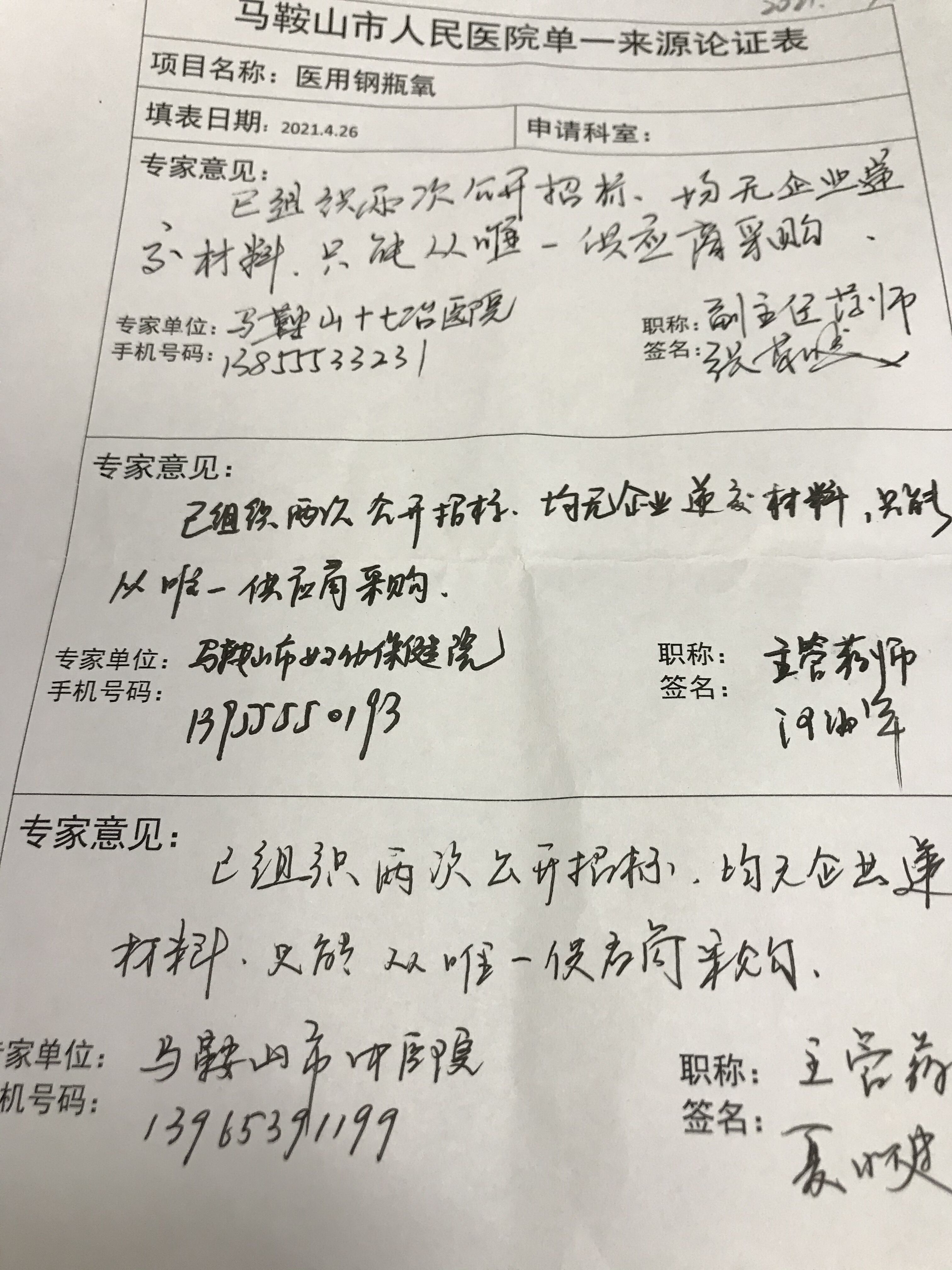 十四、專業(yè)人員對相關(guān)供應(yīng)商因?qū)@?、專有技術(shù)等原因具有唯一性的具體論證意見:(1)已于2021年3月17日、4月22日組織公開招標(biāo),在開標(biāo)當(dāng)天沒有供應(yīng)商遞交投標(biāo)文件;(2)馬鞍山市周邊地區(qū)只有南京寧衛(wèi)醫(yī)用鋼瓶氧氣有限公司,滿足在緊急情況下氧氣配送時間和配送頻率上的需求;
