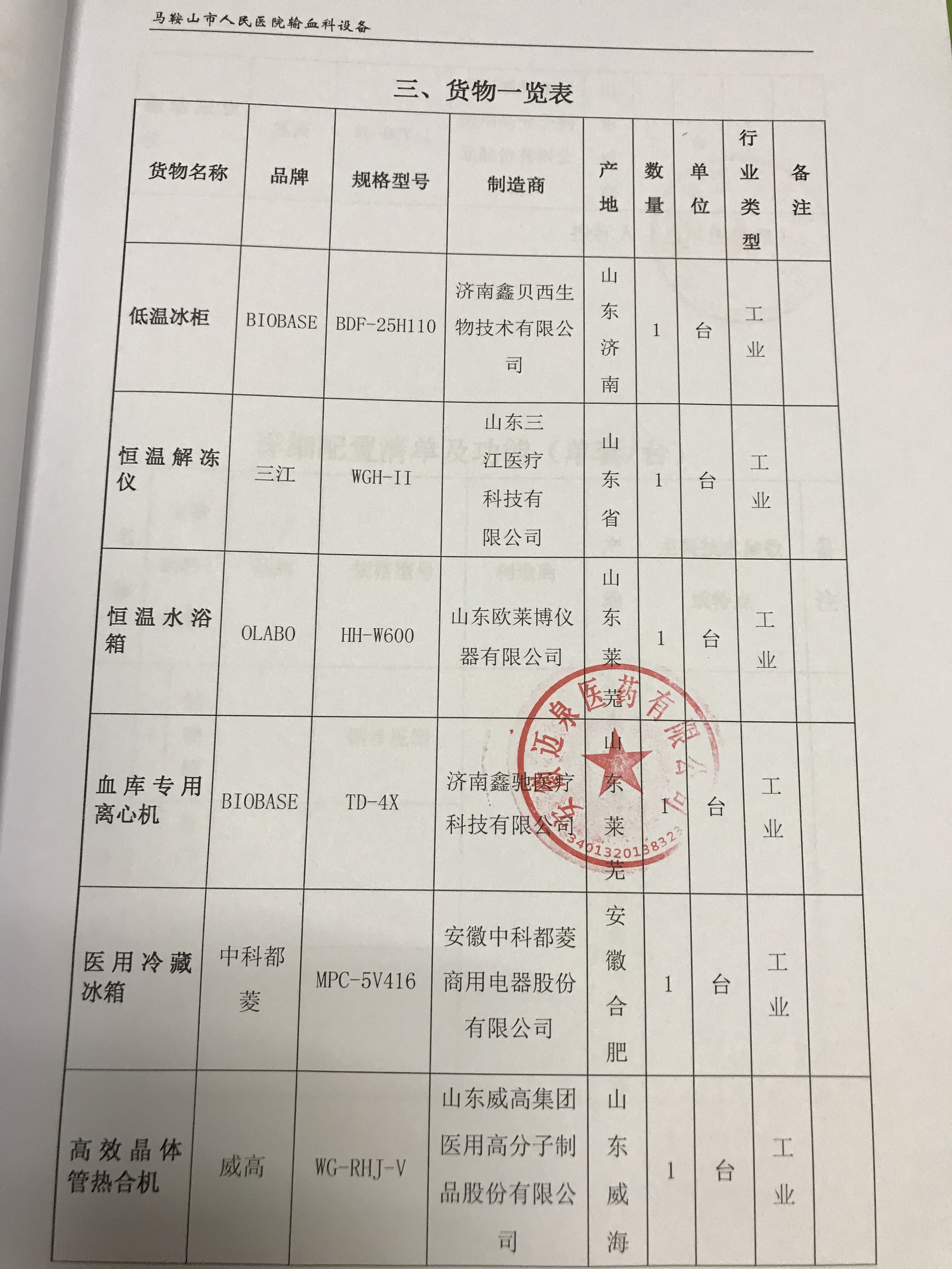 名稱:輸血科設(shè)備一批 品牌規(guī)格等:具體見附件 |