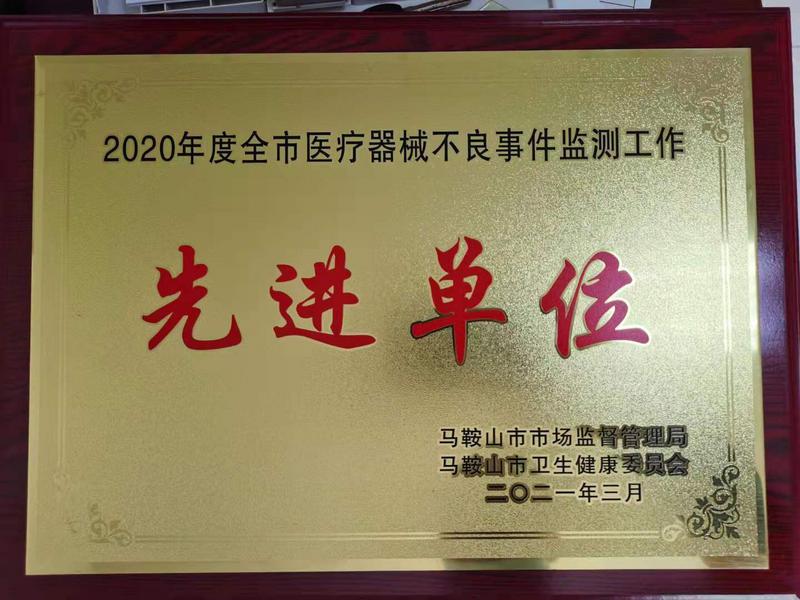 市人民醫(yī)院榮獲2020年度馬鞍山市“醫(yī)療器械不良事件監(jiān)測工作先進單位”稱號