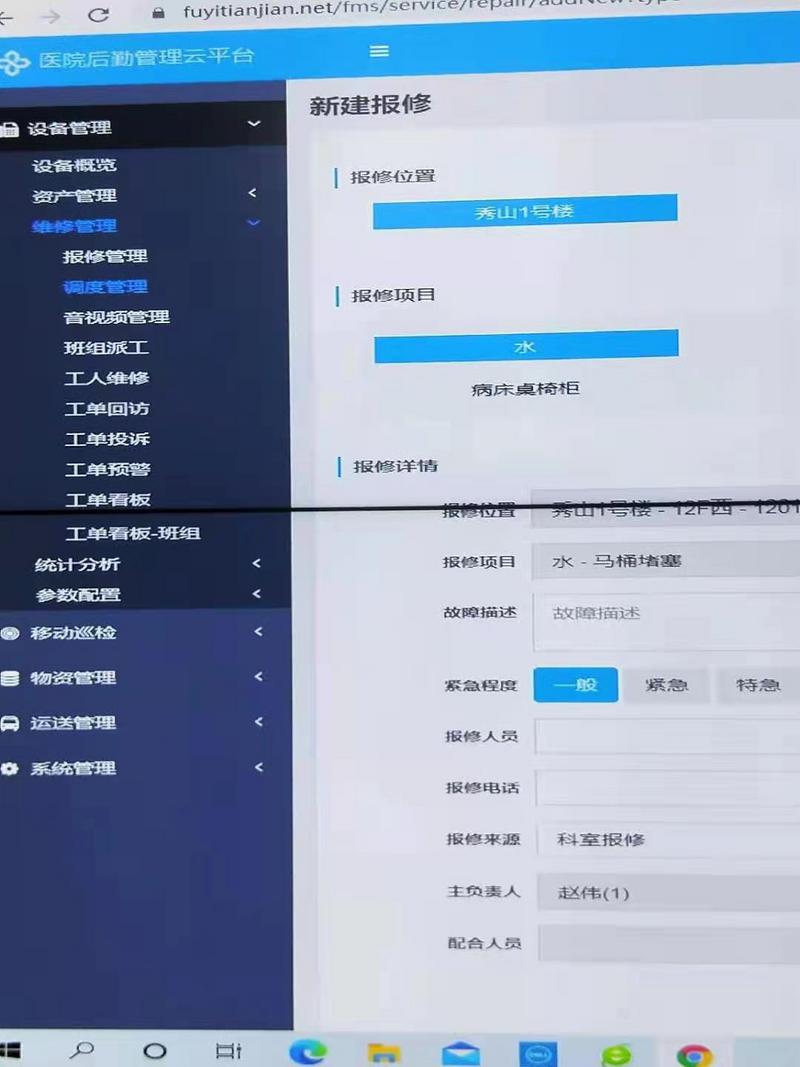 以工程報修為例,科室若遇到燈壞、空調(diào)失靈、門鎖損壞等問題,職工只需打開微信掃一掃科室的二維碼,登錄微信小程序,通過提交故障說明、圖片、視頻等,即可實現(xiàn)快速且詳細的故障報修。全新的報修系統(tǒng)告別了傳統(tǒng)報修方式存在的電話無人接聽、故障解決率低下、故障統(tǒng)計滯后等諸多弊端,構(gòu)建了臨床與總務(wù)之間的智慧連接?!搬t(yī)護-調(diào)度員-維修人員”的新模式,進一步優(yōu)化了維修管理流程,調(diào)度員及時進行任務(wù)分配,確保故障能夠得到及時妥善的處理。職工也可通過系統(tǒng),實時追蹤報修、維修進度,并能在維修工作完成后并對本次服務(wù)進行評價,實現(xiàn)全過程的有效監(jiān)督。此舉充分調(diào)動了維修人員的工作積極性,有利于改善服務(wù)態(tài)度,提高維修質(zhì)量與效率。