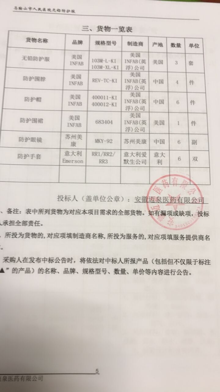 名稱:馬鞍山市人民醫(yī)院無(wú)鉛防護(hù)服(第四次)項(xiàng)目 品牌:見(jiàn)附件 |