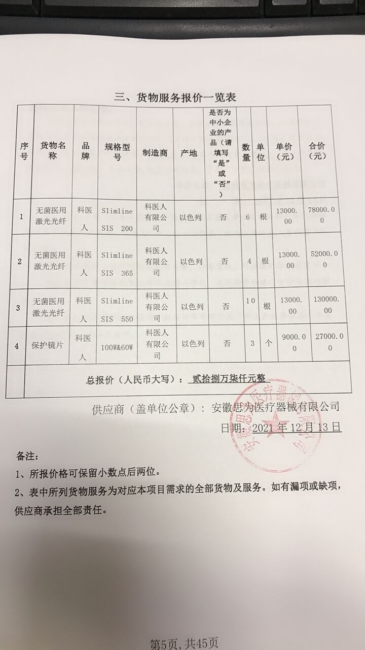 四、主要標(biāo)的信息:鈥激光設(shè)備配套光纖(進(jìn)口)