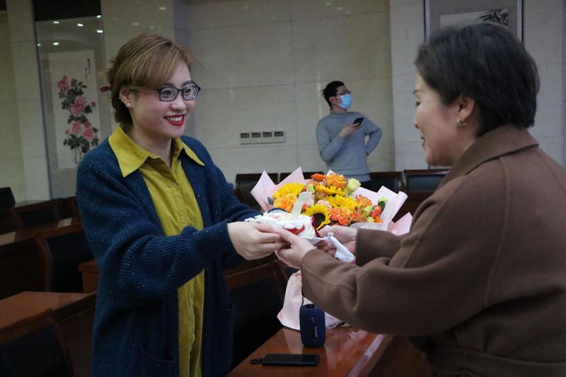 2021年6月,醫(yī)院三名醫(yī)生作為中國(安徽)第九批援南蘇丹醫(yī)療隊(duì)隊(duì)員,開始為期一年的援非醫(yī)療任務(wù)。他們不畏艱苦、甘于奉獻(xiàn),用實(shí)際行動(dòng)發(fā)揚(yáng)光大了中國援外醫(yī)療隊(duì)精神。耳鼻喉科許慶天醫(yī)生的愛人周倩應(yīng)邀來到讀書會(huì)現(xiàn)場,她深情朗讀了《一封家書》,表達(dá)了對愛人的思念和一如既往的支持。院工會(huì)為她送上了三八節(jié)的禮物--鮮花和蛋糕。