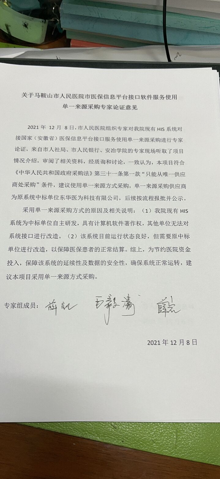 采用單一來源采購(gòu)方式的原因及說明:我院擬單一來源市醫(yī)保信息平臺(tái)接口軟件服務(wù)的采購(gòu)的理由:根據(jù)馬鞍山市醫(yī)療保障局及馬鞍山市衛(wèi)生健康委員會(huì)2021年54號(hào)文的要求,經(jīng)馬鞍山市人民醫(yī)院院長(zhǎng)辦公會(huì)議定,同意采購(gòu)市醫(yī)保信息平臺(tái)接口軟件服務(wù)項(xiàng)目,預(yù)算27.5萬元。因我院現(xiàn)有his系統(tǒng)為東華醫(yī)為科技有限公司自主研發(fā),具有計(jì)算機(jī)軟件著作權(quán),其他單位無法對(duì)該系統(tǒng)接口進(jìn)行改造,現(xiàn)申請(qǐng)單一來源方式采購(gòu),由東華醫(yī)為提供接口軟件服務(wù)。符合中華人民共和國(guó)政府采購(gòu)法第三十一條第一款“只能從唯一供應(yīng)商處采購(gòu)”條件,同意使用單一來源方式采購(gòu),后續(xù)按流程報(bào)批并公示。