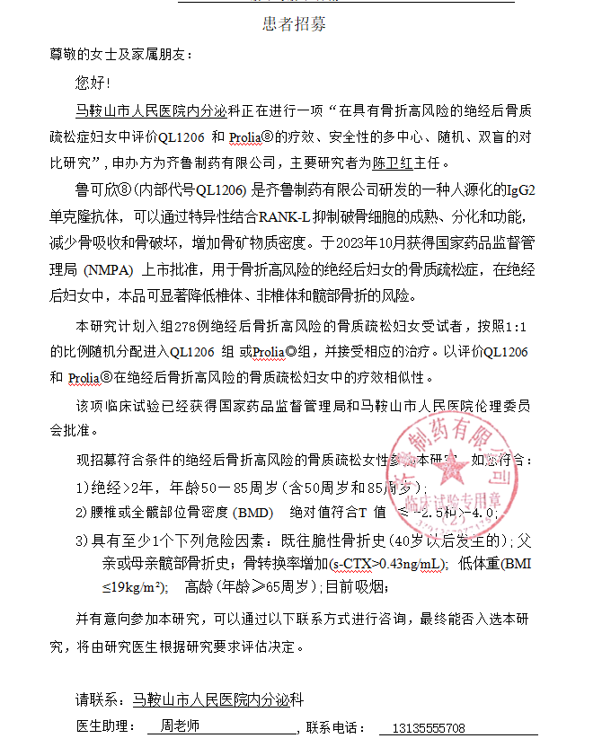 重組抗RANKL全人單克隆抗體治療婦女絕經(jīng)后骨質疏松的患者招募.png